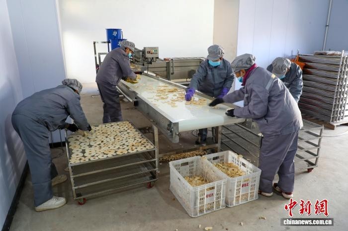 中新网晋城12月9日电 (杨佩佩 张凯)冬日时节,山西晋城高平市寺庄镇芦家峪村的黄梨深加工厂里梨香弥漫,一个个大黄梨经分拣后被送上传送带,依次完成削皮、去核、切片、清洗、烘干等多道工序,这些梨片将被分装,随时销往市场。