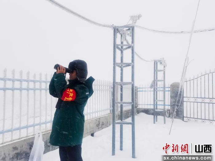 12月12日,国网山西超高压输电公司输电运检一分部运维人员在山西省运城市中条山500千伏风运线海拔最高点开展覆冰观测,保障线路安全。李杰 摄