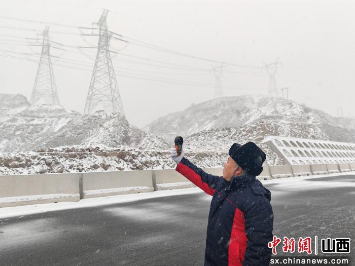 12月12日,国网山西超高压输电公司输电运检四分部运维人员在吕梁市中阳县,对±800千伏昭沂线开展防覆冰巡视,利用测风仪对大雪天气进行观测,全力保障线路安全。刘春文 摄
